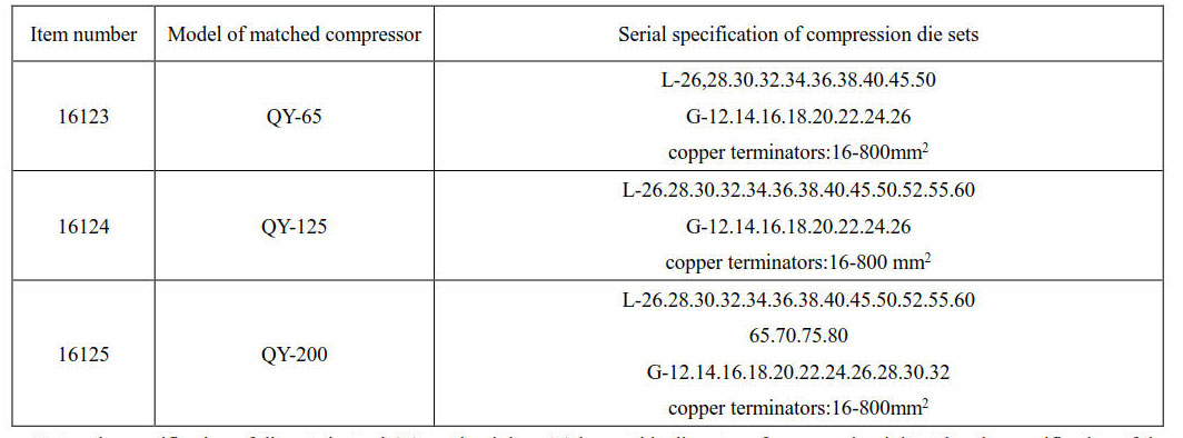 the specification of die sets is steel (G)or Aluminium (L)the outside diameter of compression joint tube .the specification of the dies can be customized according to the size of the steel tube or aluminium tube for the conductor.
